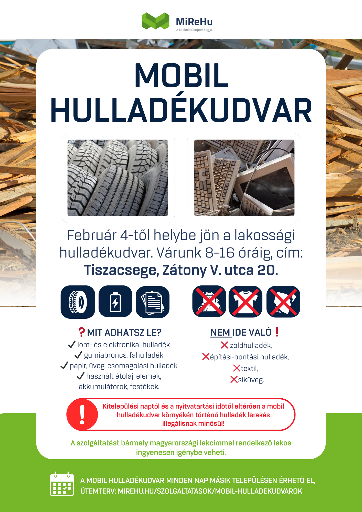 • A mobil hulladékudvar helyben, előre meghirdetett napokon fogadja a lakosságot